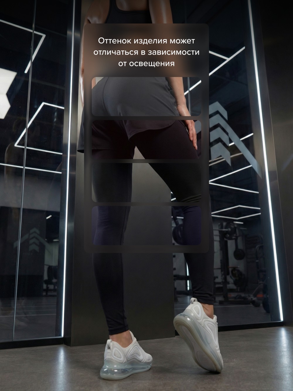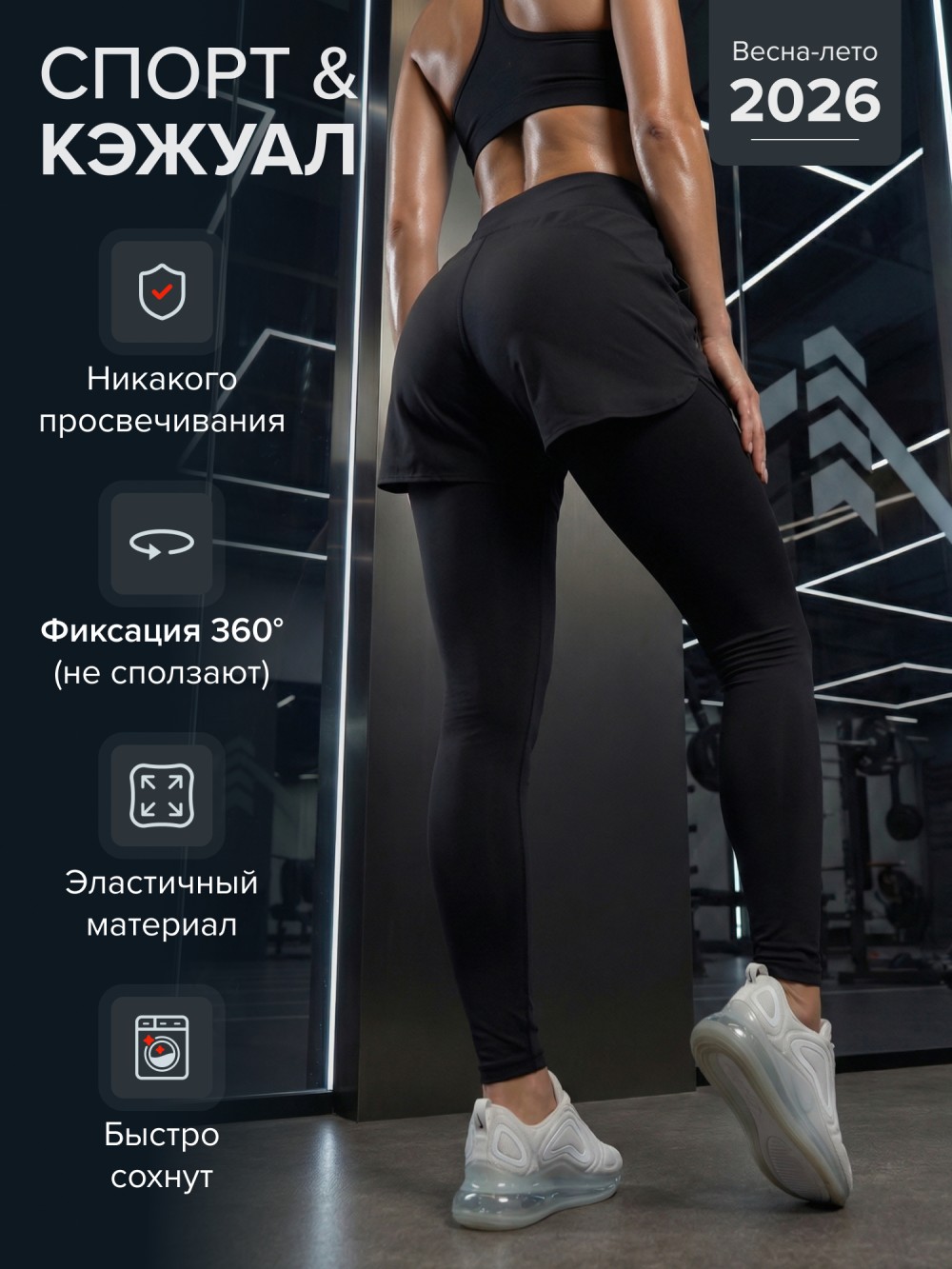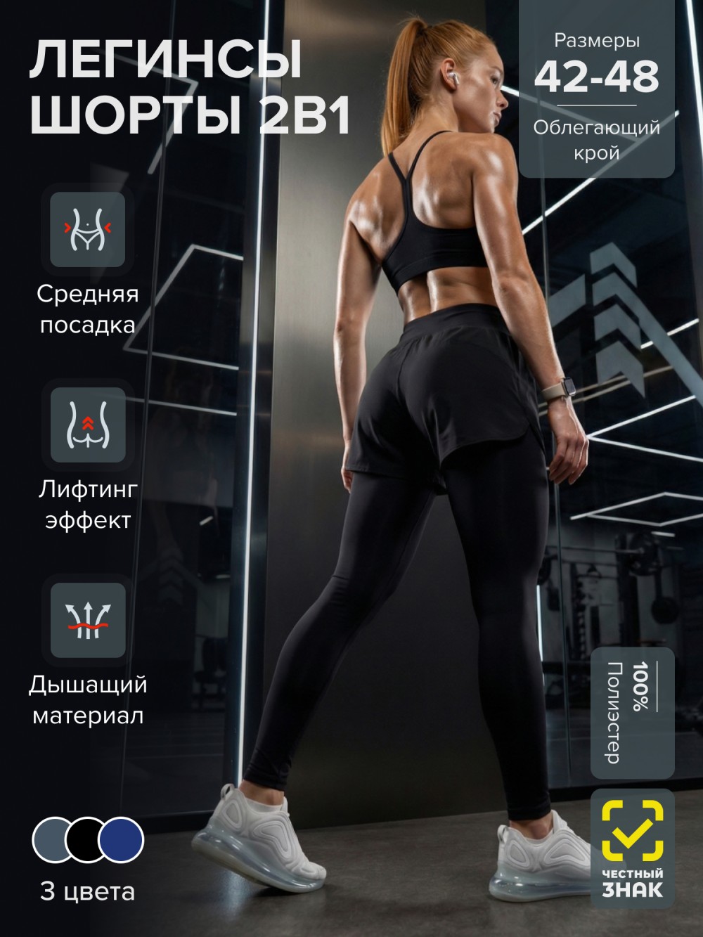Высокая посадка фиксирует талию, ткань не просвечивает и сохраняет форму даже при интенсивных нагрузках. Модель подходит для фитнеса, бега, зала, функциональных тренировок и повседневного ношения.