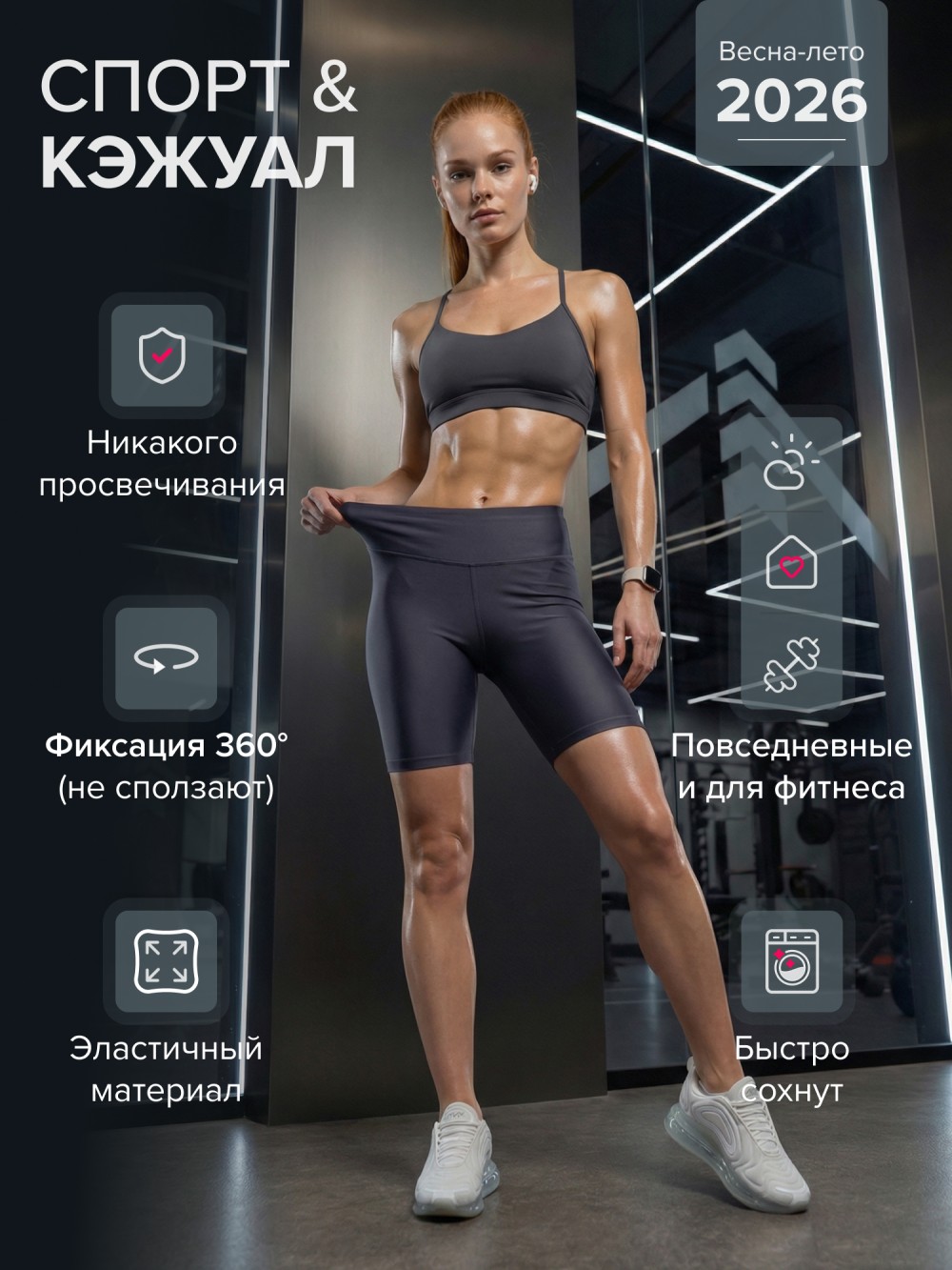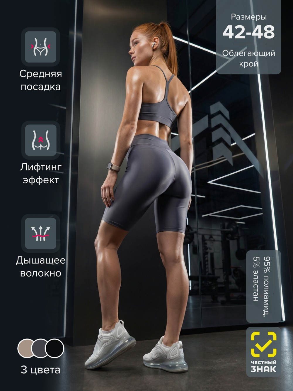 Плотный высокоэластичный материал обладает гладкой фактурой и эффектом легкой компрессии. Ткань не просвечивает, держит форму и сохраняет безупречный внешний вид после многократных стирок. Посадка остается стабильной во время тренировок, бега, силовых нагрузок и повседневной носки.