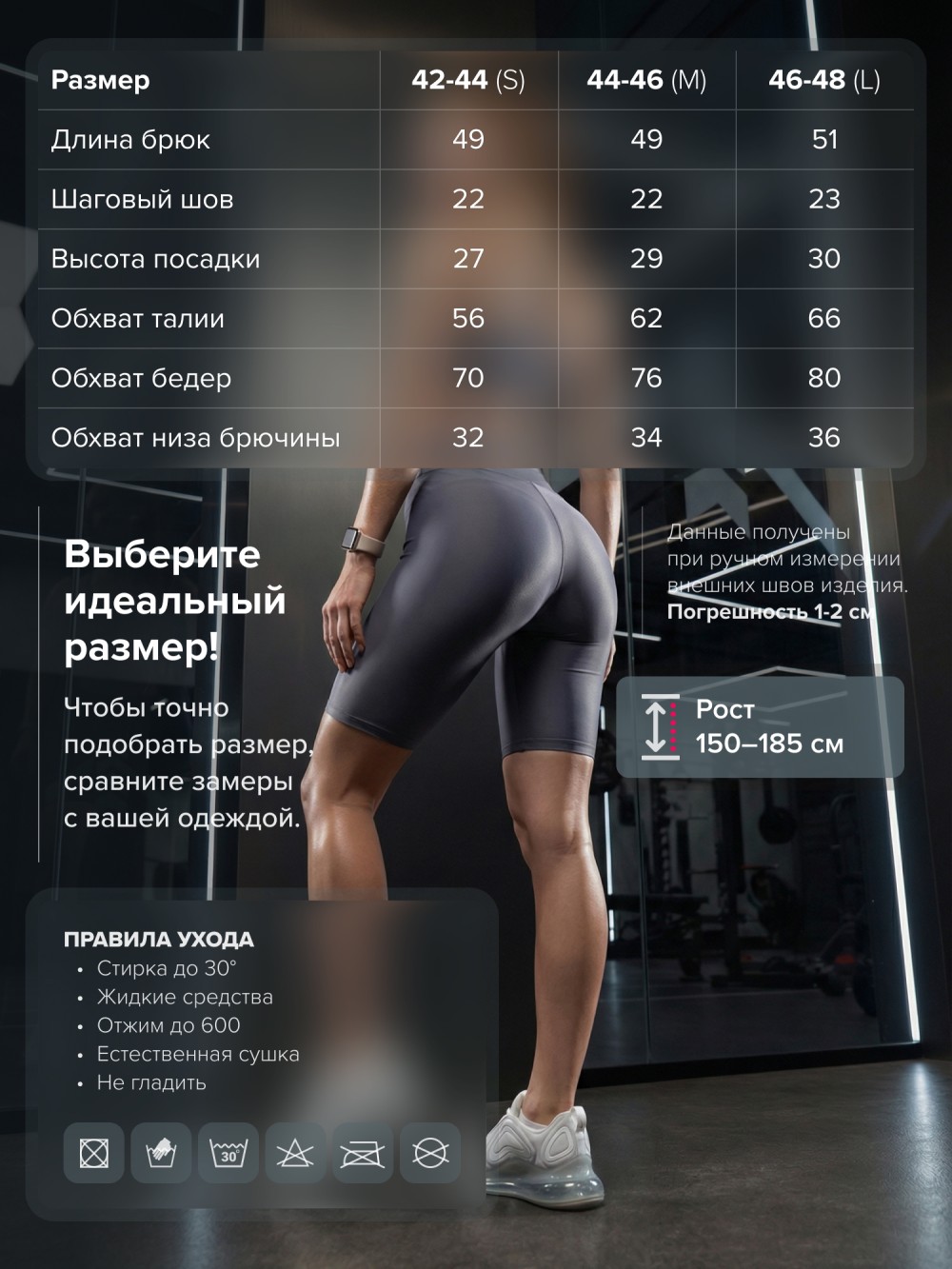 Размер Длина шорт Шаговый шов Высота посадки Обхват талии Обхват бедер Обхват голени (штанины)