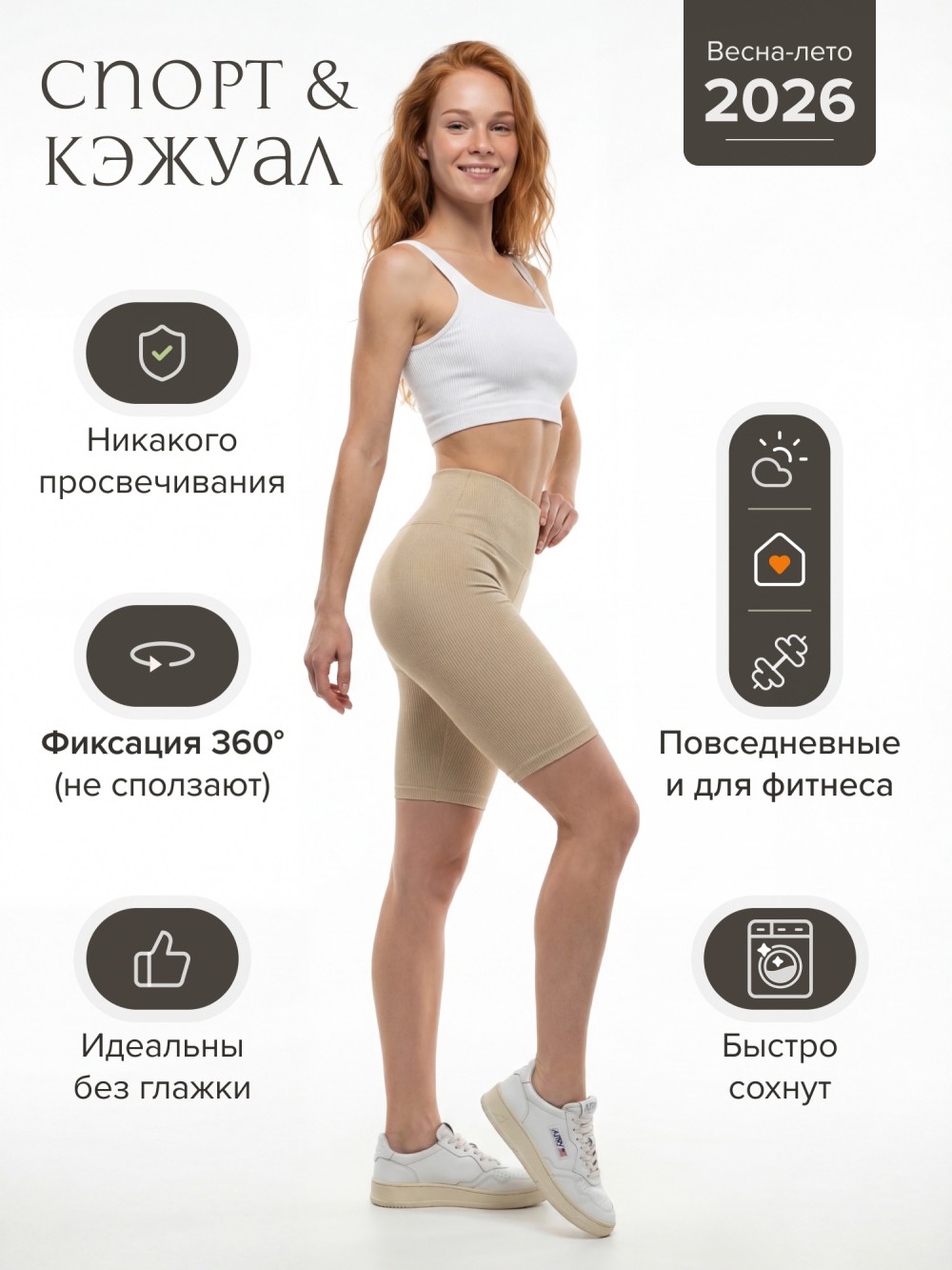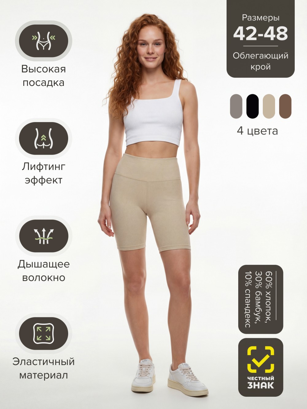Модель подходит для фитнеса, йоги, тренировок и повседневных образов. Легко сочетается с топами, футболками и спортивными комплектами.