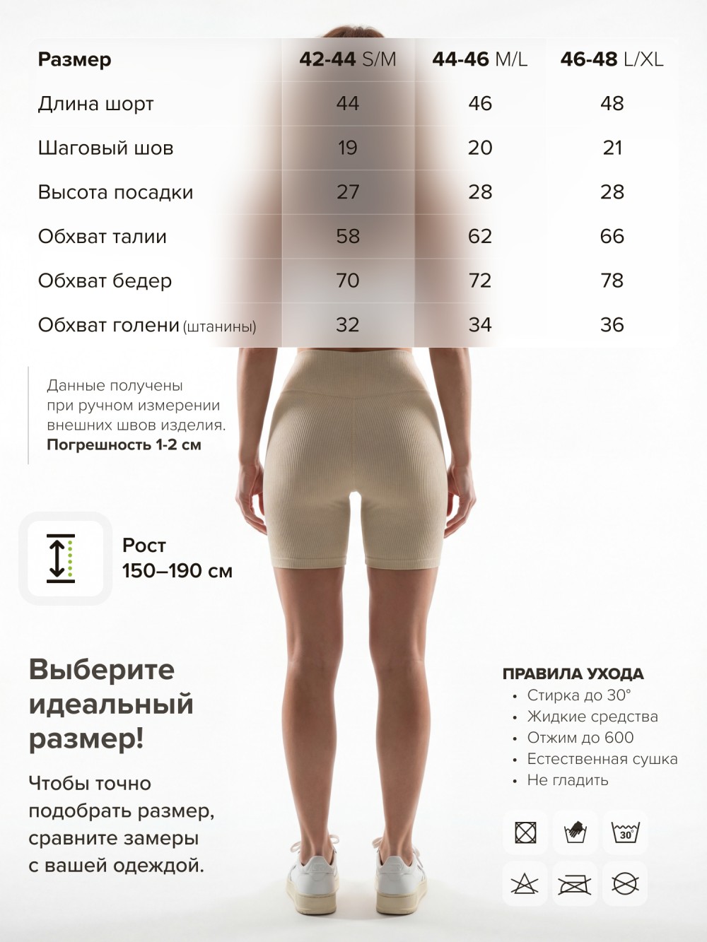 | Размер | Длина шорт | Шаговый шов | Высота посадки | Обхват талии | Обхват бедер | Обхват голени (штанины) |